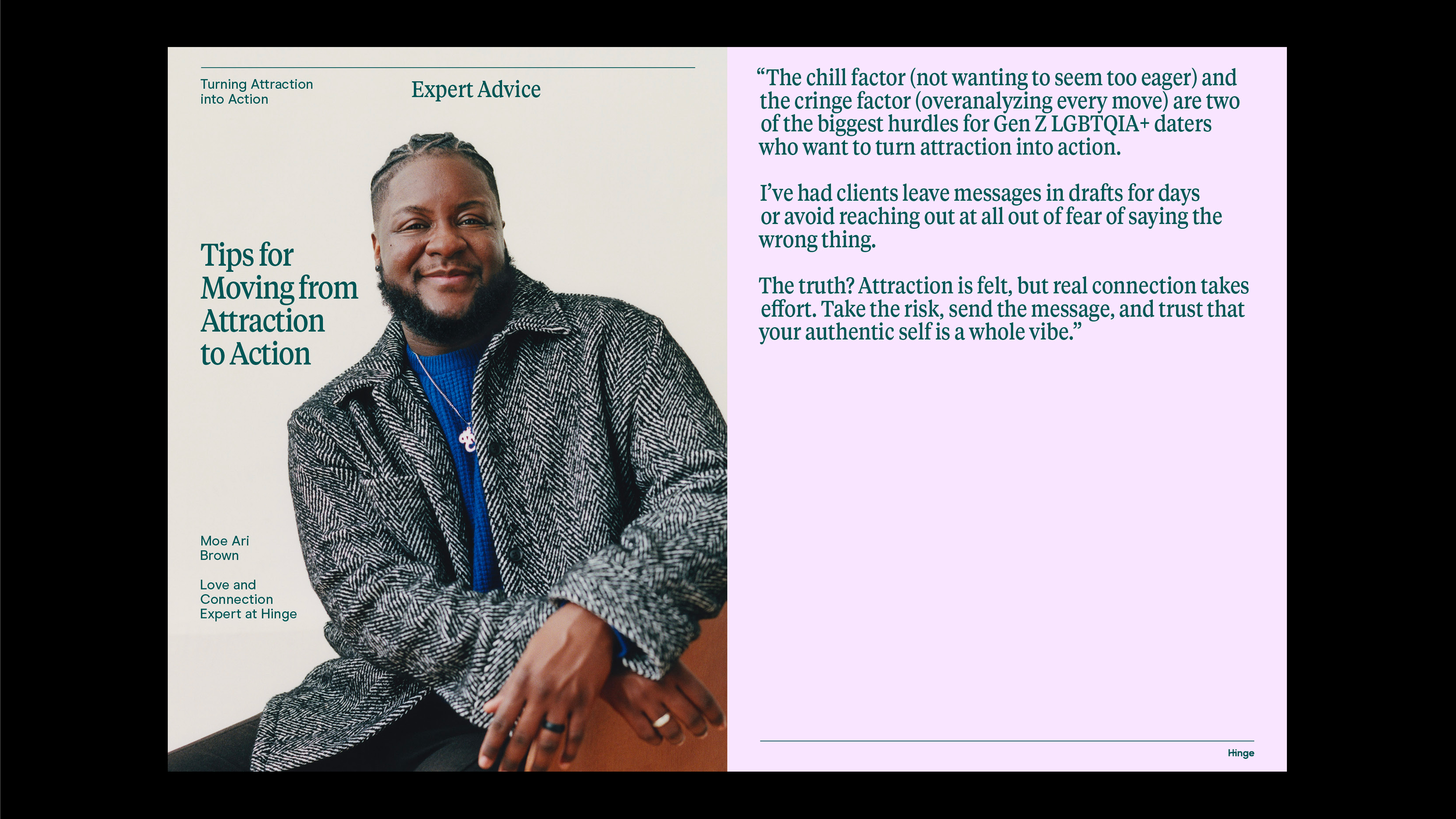 The editorial design system is inspired by the structure and adaptability of a magazine. It brings to life rich data visualizations, real quotes from LGBTQIA+ daters, and shares guidance from Hinge Experts on navigating the dating landscape.